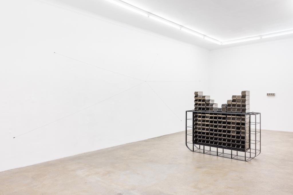 The Sichtlagerkasten is a semi-open front storage container that can be stacked to provide maximum efficiency and easy accessibility when organising contents of various kinds. Sicht is the German word for sight, visibility, a prospect. Lager the word for store, stock, but also the camp. A Kasten is a box, though it is also a showcase. As an elemental form that gives shape to a number of works in the exhibition, the proliferating Sichtlagerkästen demonstrate the ways in which processes of configuration and constellation can generate difference through repetition. As a conceptual container, however, the Sichtlagerkasten performs less as binary code than as social encryption. Condensed into its relatively simple form are multiple metaphors and interpretative possibilities: for the body, the mind, a social body, and the interactions facilitated or precluded between all of these.